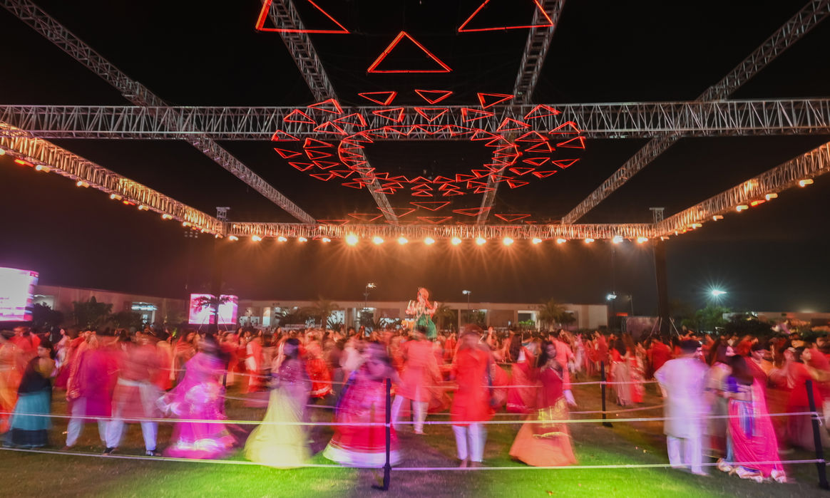 Scarlet Echoes captures the cultural richness of red and the rhythmic flow of Garba. “Scarlet” reflects the vibrance and fervor of this revered hue, while “Echoes” represents the lasting resonance of devotion through every beat and every step. The circular motion of Garba mirrors the cycles of life, time and divine energy, connecting tradition with the vibrant pulse of the present. We echo red and its many shades, celebrating collective well-being in an ambiance crafted for you to experience the magic of the starry night.